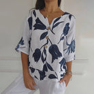 هذا البلوزة تأسر بجمال طبعتها الزهرية الرقيقة وفتحة العنق على شكل V الأنيقة. قصتها الواسعة وأكمامها القصيرة توفر شعورًا بالخفة والراحة. الأزرار في المقدمة تضيف لمسة كلاسيكية مع تسهيل ارتدائها.