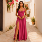هذه الفستان الطويل بدون أكمام تجسد الأنوثة برقي. قصتها تبرز الأكتاف، بينما تنسجم التنورة السائلة المنقسمة مع كل حركة بأناقة. ناعمة للمس ومريحة للارتداء، تناسب السهرات الرسمية وكذلك اللحظات الأكثر استرخاءً.