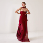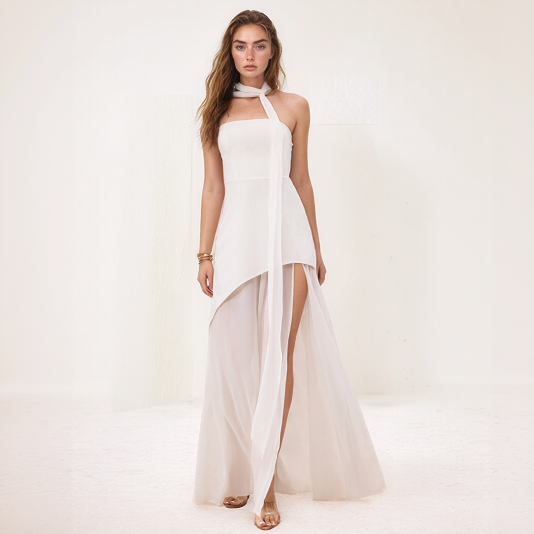 Dieses elegante lange Kleid präsentiert einen asymmetrischen Schnitt mit einem hohen und niedrigen Saum und einer Überlagerung, die Tiefe und Bewegung hinzufügt. Das integrierte Schal-Detail wickelt sich zart um den Hals oder drapiert sich über die Schulter für ein elegantes Finish. Hergestellt aus leichtem Stoff, bietet es eine fließende und bequeme Silhouette.