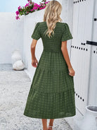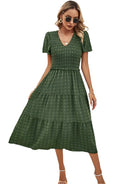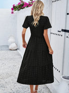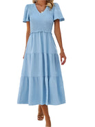 Αυτή η μποέμικη κομψή φόρεμα με κοντά μανίκια είναι ιδανική για μια εμφάνιση ταυτόχρονα χαλαρή και κομψή. Η σμιλευμένη μέση αναδεικνύει τη σιλουέτα, ενώ η ρευστή γραμμή της εξασφαλίζει άνεση. Ιδανική για το καλοκαίρι, τις εξόδους ή τις ηλιόλουστες μέρες.