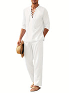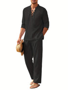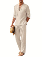 Dive into relaxed elegance with this chic bohemian set consisting of a long-sleeved top adorned with a lace-up neckline and fluid wide-leg pants. Ideal for sunny days or casual getaways, this set combines style and comfort. Its lightweight fit, practical pockets, and adjustable waist make it a choice that is both aesthetic and functional.