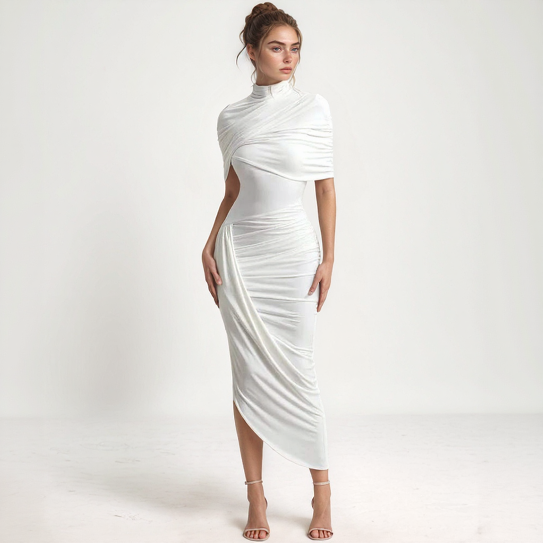 Nelly | Pitkä Elegantti Mekko – Epäsymmetrinen Leikkaus Ja Integroitu Huivi