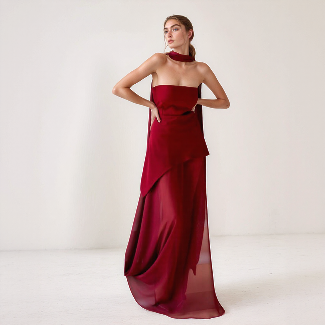 Perry | Kaksi osaa pitkä mekko – Olkaimeton eleganssi ja yhteensopiva huivi