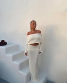 Tämä tyylikäs asu yhdistää olkapäät paljastavan yläosan ja siihen sopivan hameen hienostuneessa teksturoidussa kankaassa. Sen leikkaus korostaa siluettia samalla kun se tarjoaa suurta mukavuutta. Ihanteellinen juhlaville ulkoiluille tai erityisiin tilaisuuksiin.