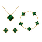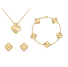 Tämä kokoelma, joka koostuu kaulaketjusta ja rannekorusta, korostaa apilanmuotoista kuvioita, onnen ja viehätyksen symbolia. Täydellinen päivittäisten asujen tai erityisten tilaisuuksien korostamiseen, se yhdistää hienostuneisuuden ja läsnäolon.