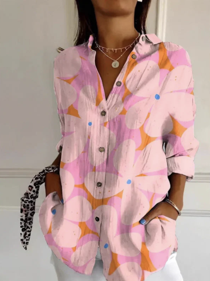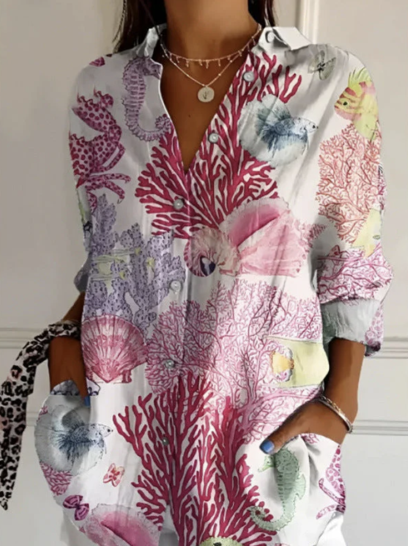 Ta zwiewna bluzka wyróżnia się artystycznym nadrukiem i powietrzną sylwetką, która delikatnie podąża za Twoimi ruchami. Idealna na słoneczne dni lub luźne wyjścia, łączy komfort z oryginalnością w subtelny sposób. Jej boho-chic styl dostosowuje się do wszystkich Twoich pragnień.