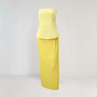 Ten zestaw łączy w sobie crop top bez ramiączek, który podkreśla ramiona, z długą plisowaną spódnicą o swobodnym kroju. Idealny na eleganckie okazje, łączy nowoczesny szyk z komfortem przez cały dzień.