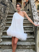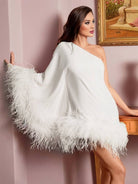 Această rochie scurtă trapez cu o umăr este ideală pentru ocazii speciale. Designul său unic cu mâneci de tip capa adaugă o notă de sofisticare. Perfectă pentru cocktailuri, baluri sau petreceri.